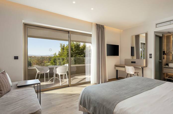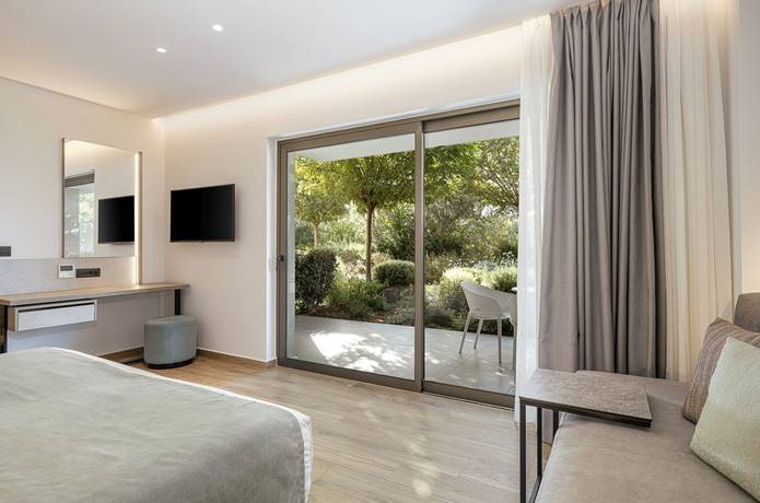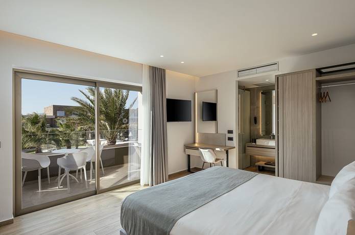 This accommodation option matches minimalism with contemporary interior design ideas, shaping an inviting and relaxing atmosphere for your summer vacation in Crete. A spacious suite that allows for a comfortable living, bathed in natural light, that creates a cozy spot for some reading or a glass of wine. Either looking at the beautiful sparking blue sea or towards the full breadth or our premises, this accommodation option is great for you and your companion.