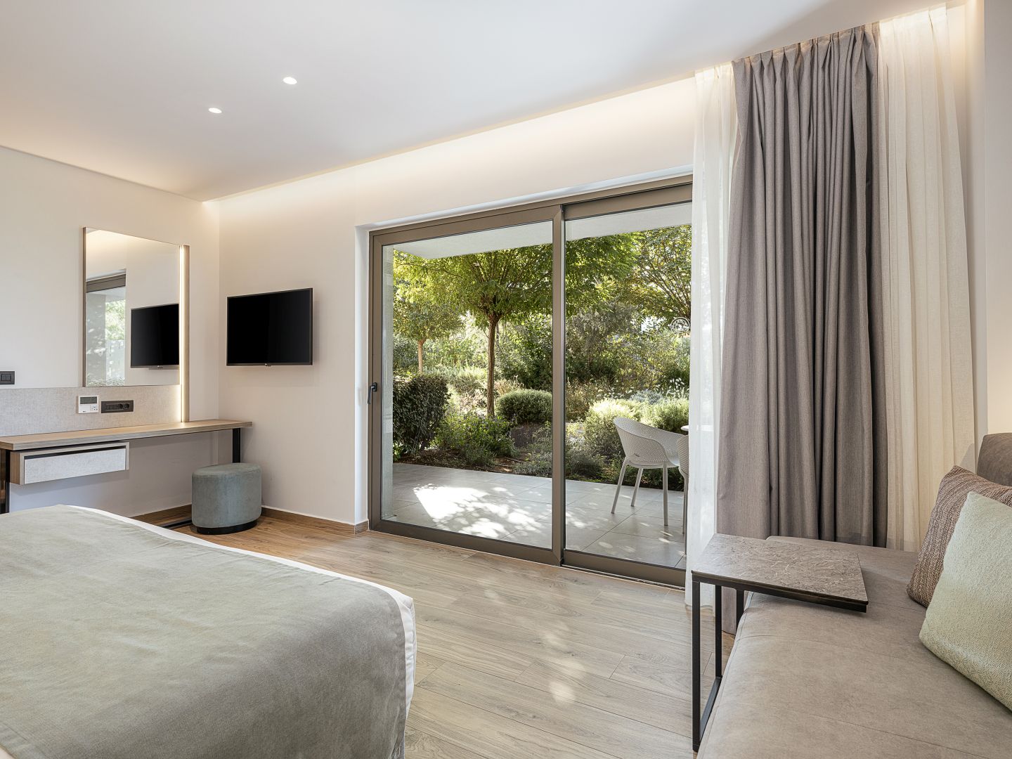 This accommodation option matches minimalism with contemporary interior design ideas, shaping an inviting and relaxing atmosphere for your summer vacation in Crete. A spacious suite that allows for a comfortable living, bathed in natural light, that creates a cozy spot for some reading or a glass of wine. Either looking at the beautiful sparking blue sea or towards the full breadth or our premises, this accommodation option is great for you and your companion.