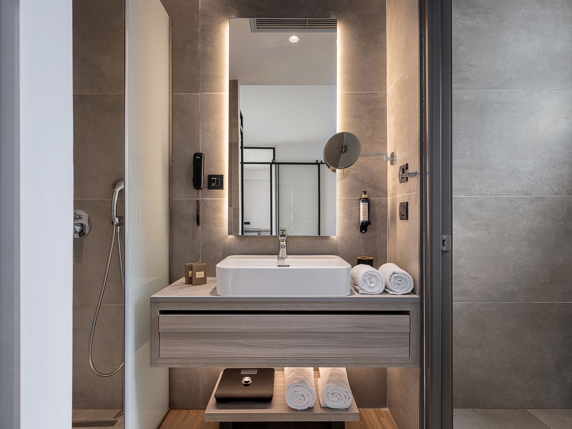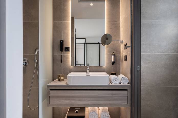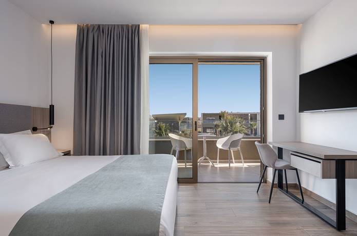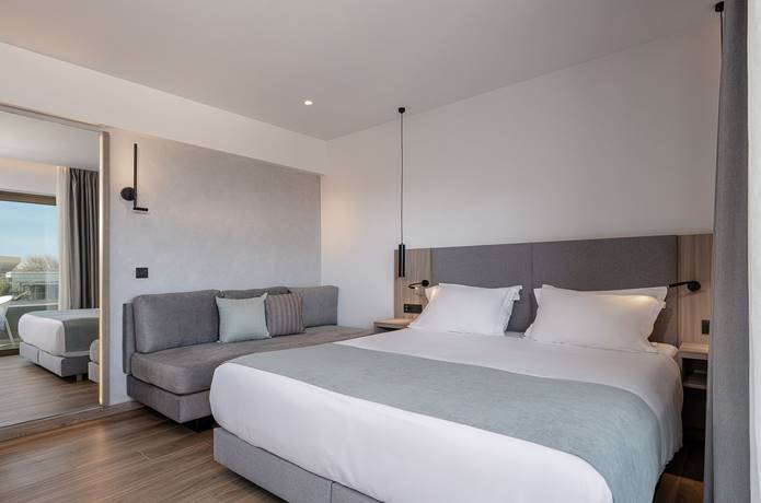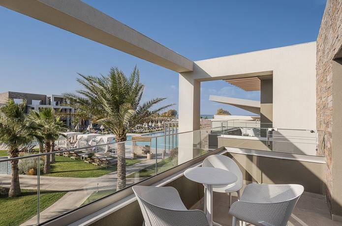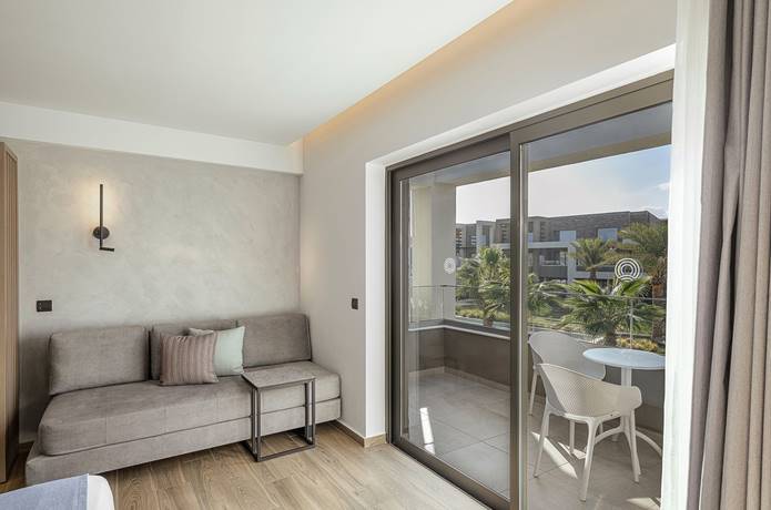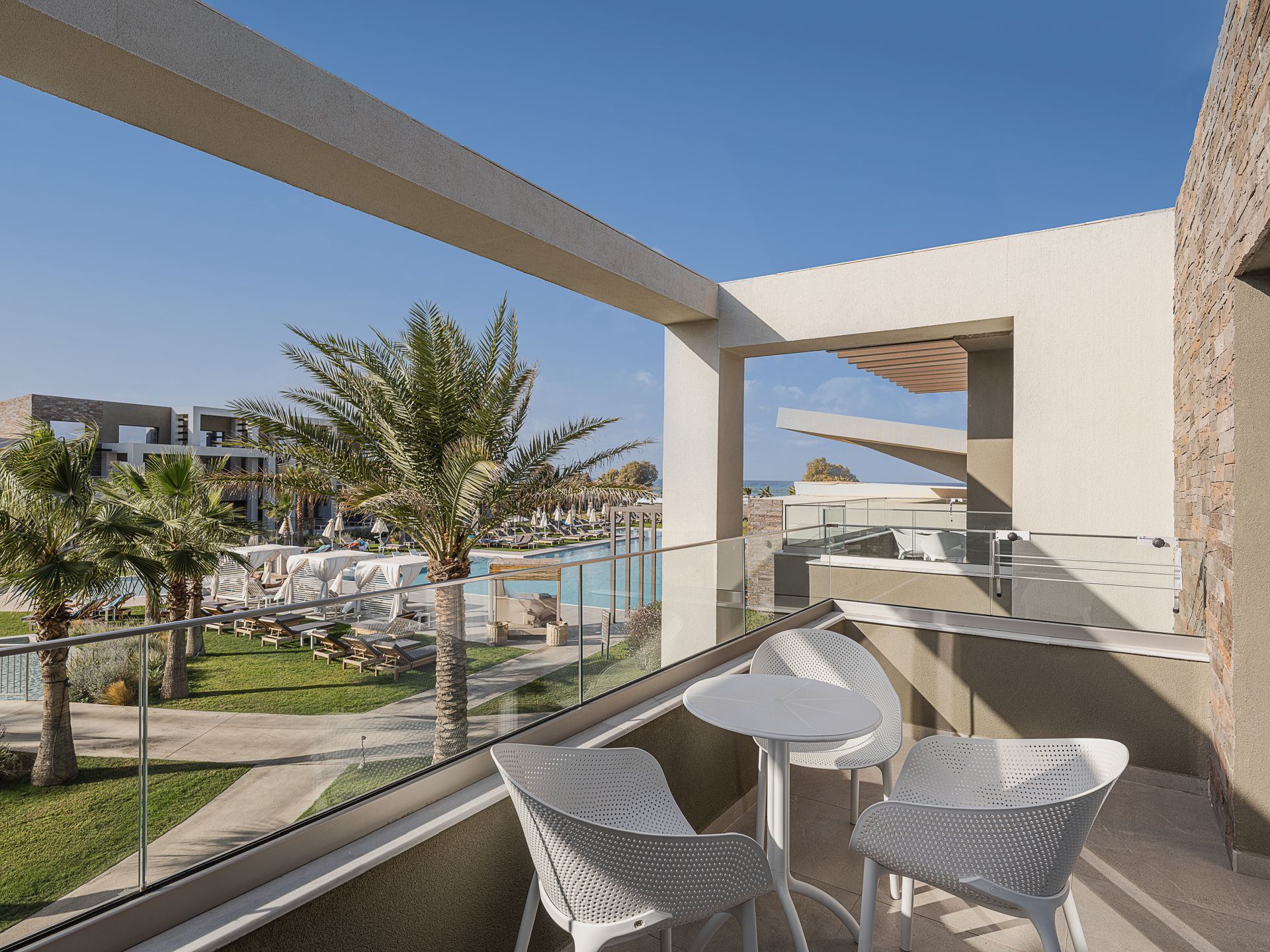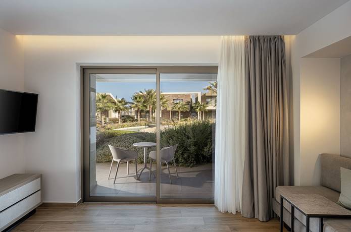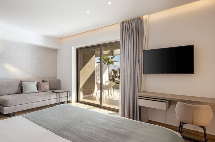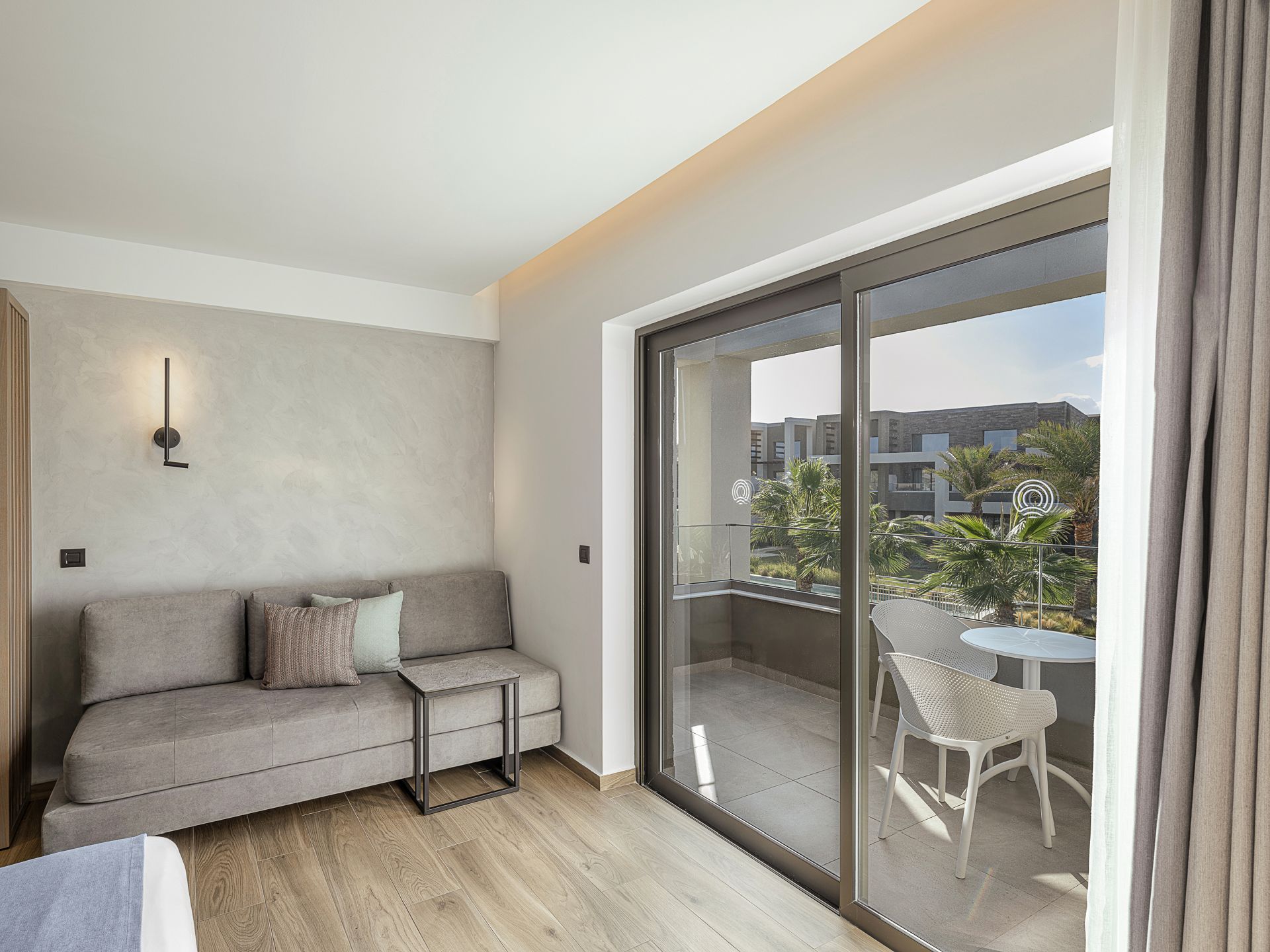This accommodation option matches minimalism with contemporary interior design ideas, shaping an inviting and relaxing atmosphere for your summer vacation in Crete. A spacious suite that allows for a comfortable living, bathed in natural light, that creates a cozy spot for some reading or a glass of wine. Either looking at the beautiful sparking blue sea or towards the full breadth or our premises, this accommodation option is great for you and your companion.